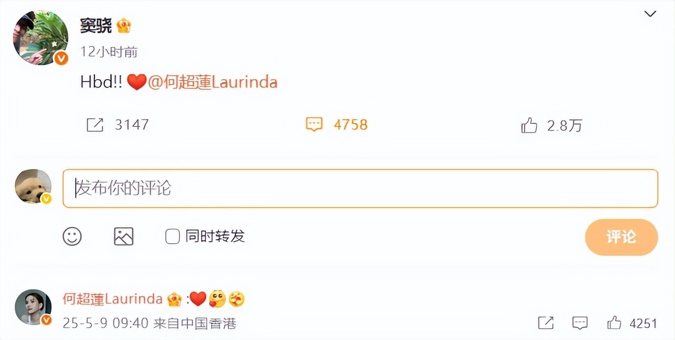 今年5月何超莲生日当天,窦骁虽准时在微博送上祝福,但女方直到次日上午9点才回应,且两人IP地址显示分处不同城市。